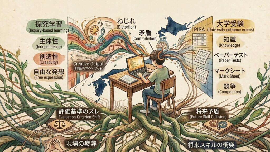 日本の教育課題は、生徒に主体性がないことではなく、「『探究』という新しいアプリケーションを導入したにもかかわらず、最終評価を下す『大学受験』という根幹のシステムが旧世代のままであることのねじれ」に他なりません。