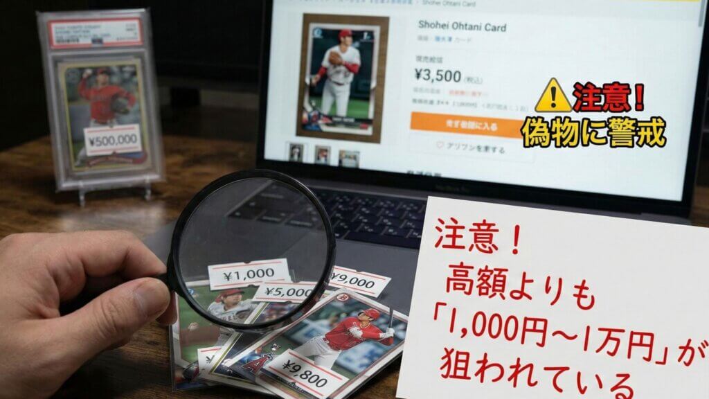 実はそれは誤解です。 プロの詐欺師は、鑑定が厳しい高額カードよりも、「ファンが小遣いで買える1,000円〜1万円」の価格帯を狙っています。