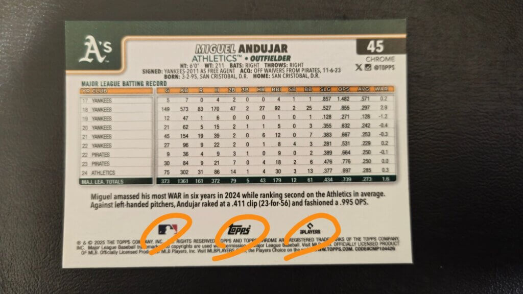 基本的にMLBのカードを発行できるのは、ライセンスを持つTOPPS社や、選手会と契約しているPANINI社などに限られます。 球団や企業が記念にカードを発行することもありますが、その場合も必ず「企業のロゴ」や「ライセンス表記」が印字されています。