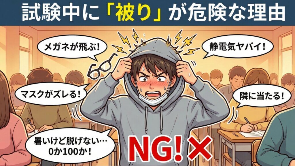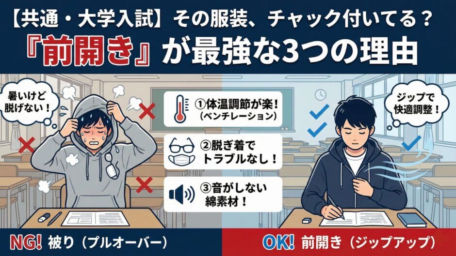 被りパーカーの最大の弱点は、体温調節が「着るか・脱ぐか」の二択(0か100か)しかないことです。 試験中、「少し暑いな」と感じて脱げば寒くなり、着ればまた暑くなる……この「無限ループ」に入ると集中力が削がれます。