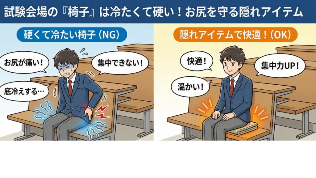 寒さ対策ばかりに気を取られがちですが、「会場の暑さ」と「椅子の硬さ」への対策こそが、後半の科目の集中力を持続させるカギとなります。